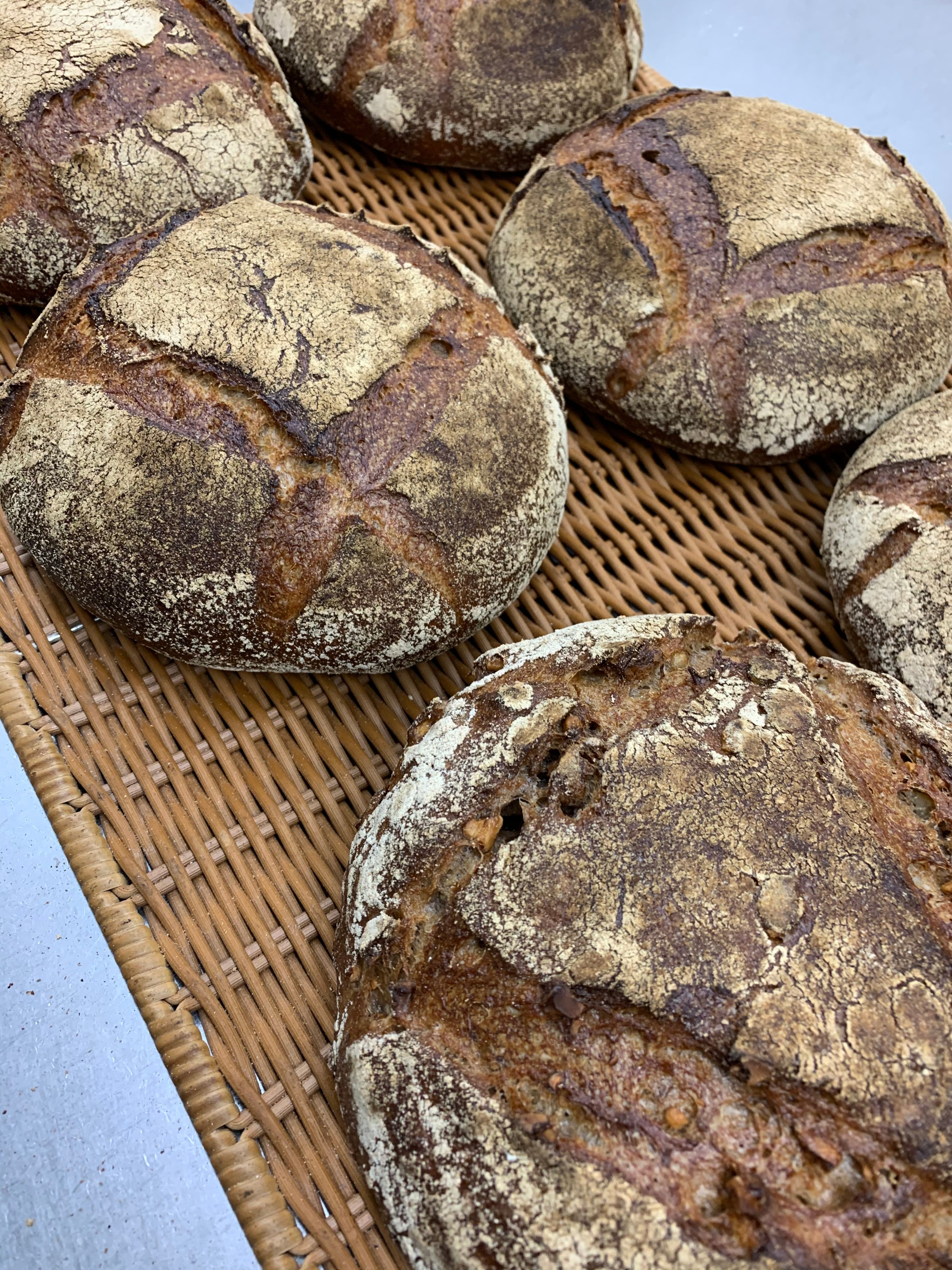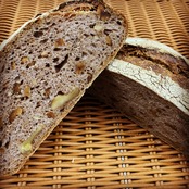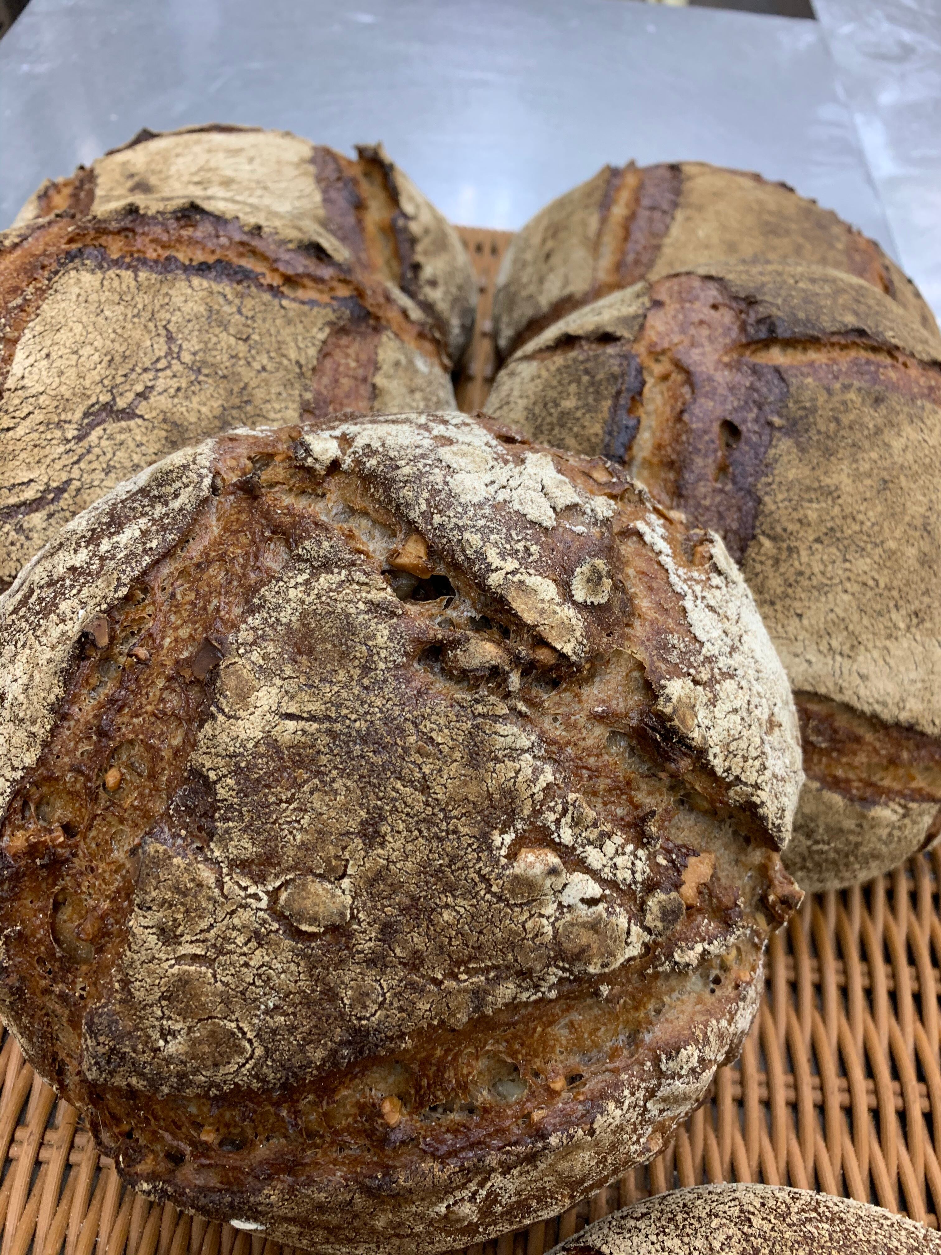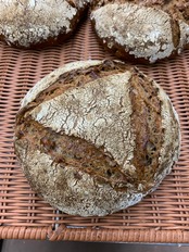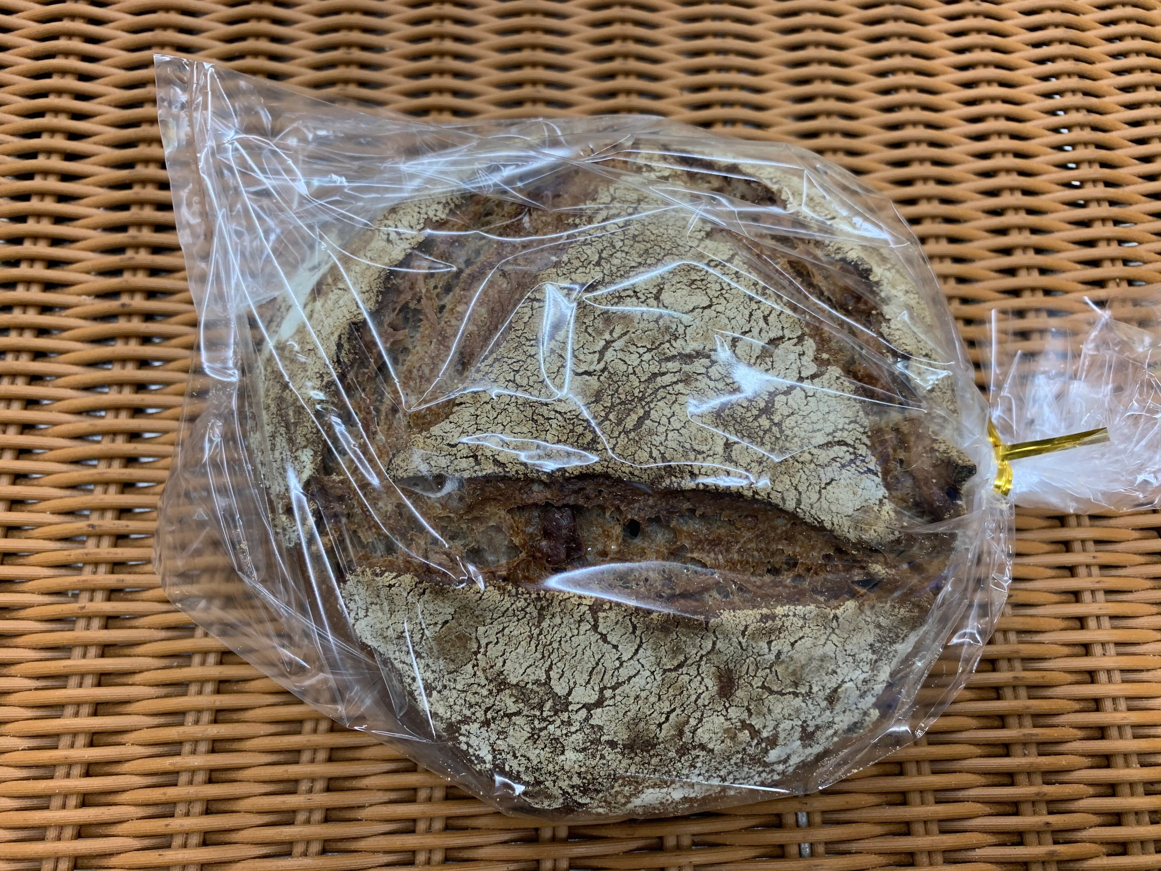 くるみ入りのライ麦パンです。程よい酸味のライ麦パンに濃厚なまろやかさの中に香ばしいくるみの香りと苦味がクセになります。16㌢の丸型です。