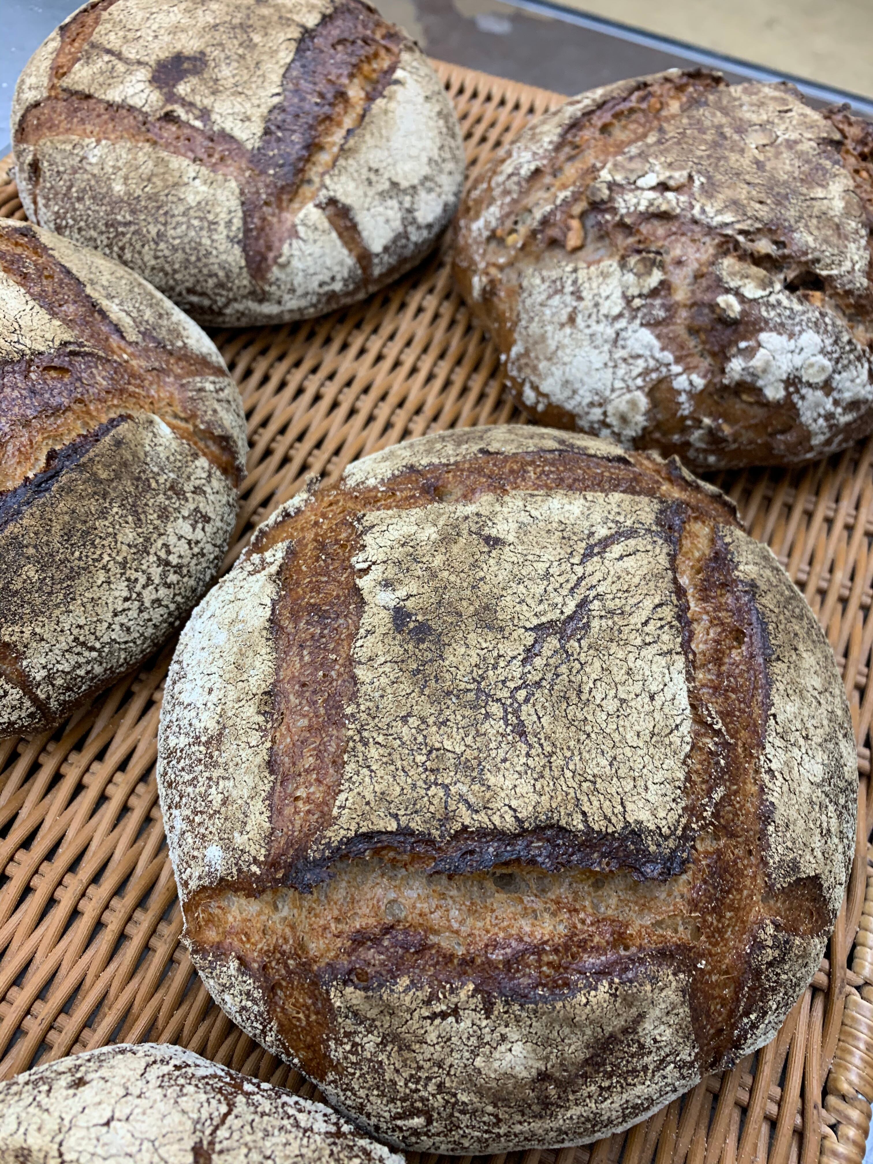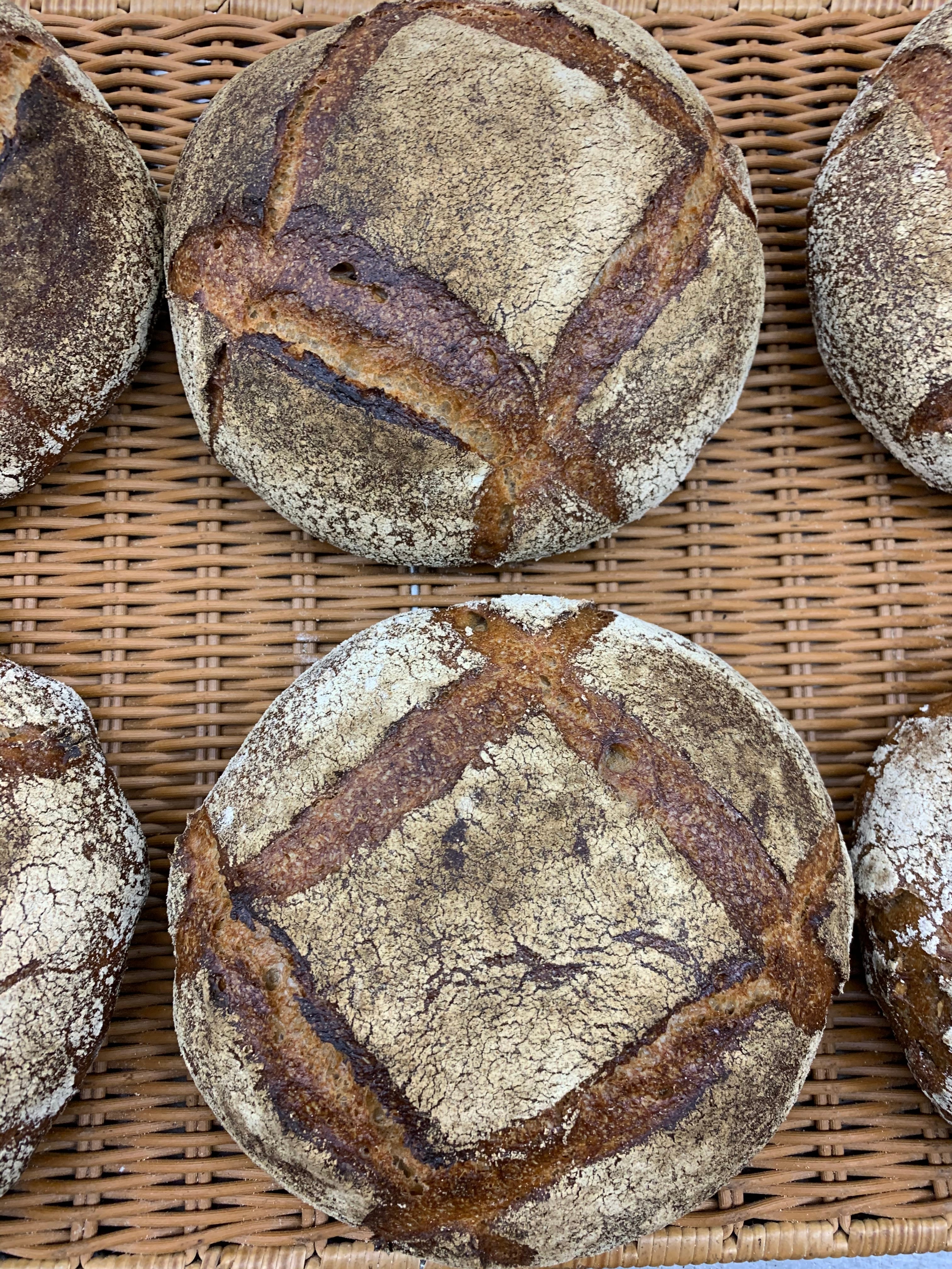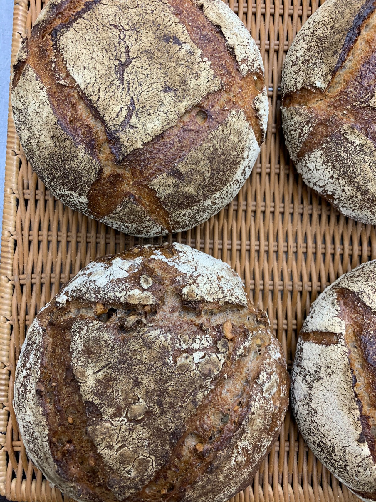 くるみ入りのライ麦パンです。程よい酸味のライ麦パンに濃厚なまろやかさの中に香ばしいくるみの香りと苦味がクセになります。16㌢の丸型です。